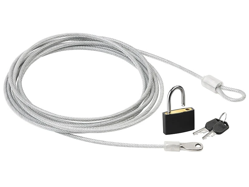 Extra lang: Dank 3 Metern Länge können Sie auch große und breite Gegenstände mit dem Stahlseil sichern. Befestigen Sie das Vorhängeschloss in der Öse und nutzen Sie zwei Schlüssel zum Öffnen und Schließen.