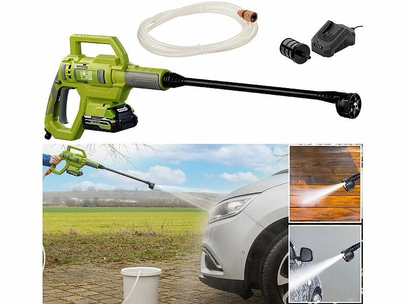 - Akku-Druckreiniger inklusive Akku, Schnell-Ladegerät, Schlauch, Schlauchfilter, Verlängerungslanze, Adapter für Gartenschläuche und deutscher Anleitung – Akku-Druckpistolen – Außerdem relevant oder passend zu: Dampfreiniger