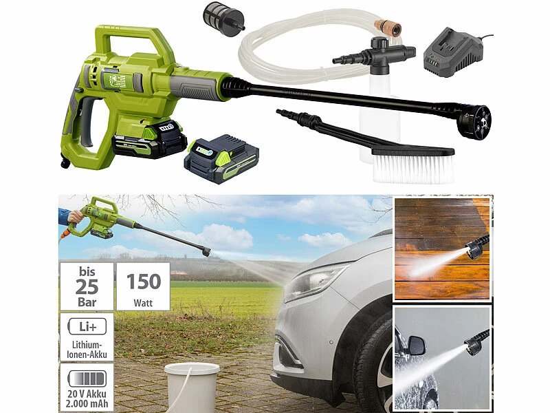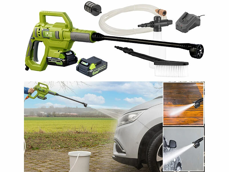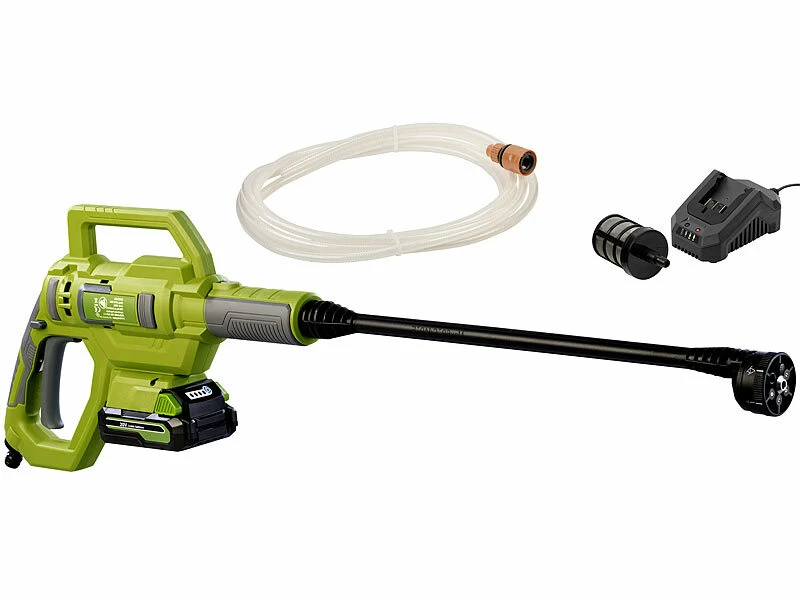 - Akku-Druckreiniger inklusive Akku, Ersatzakku, Schnell-Ladegerät, Schlauch, Schlauchfilter, Verlängerungslanze, Adapter für Gartenschläuche, Zubehör-Set und deutscher Anleitung