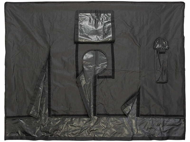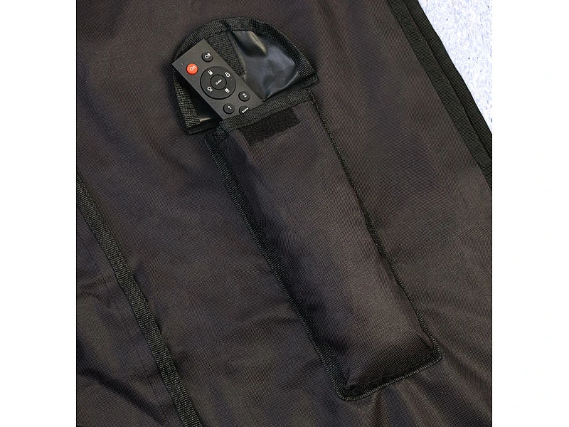 Sicherer Halt: Dank Klettverschluss hält diese Abdeckung bombensicher auch bei stürmischem Wetter. Einfach überstülpen und Klettverschluss schließen. Für Ihre TV-Halterung existiert eine geschützte Aussparung an der Rückseite. Und die Fernbedienung verstauen Sie einfach in der integrierten Tasche.