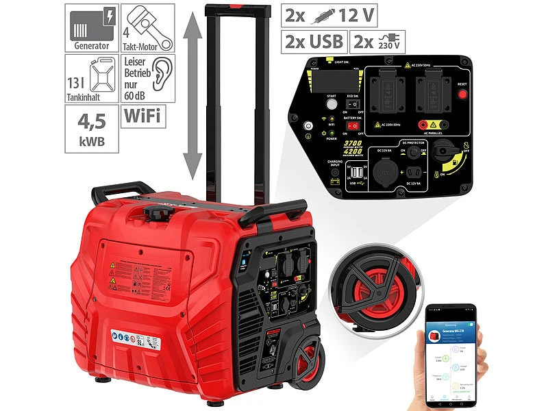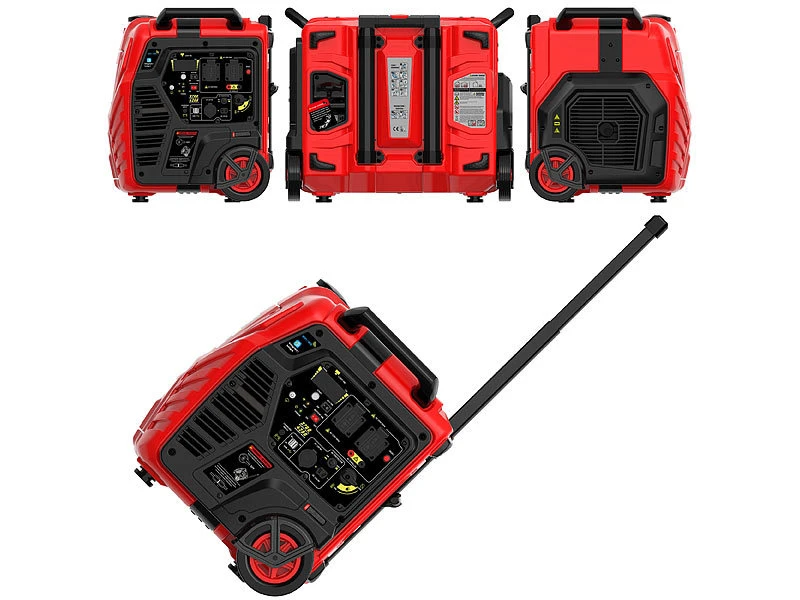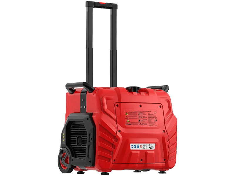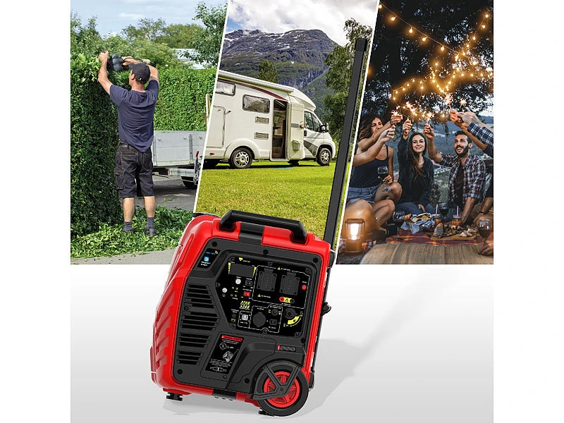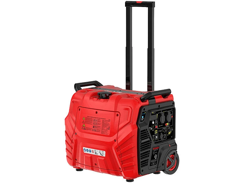 Erzeugen Sie Ihren eigenen Strom – daheim und unterwegs: Dank Ihres neuen Benzin-Inverter-Generators sind Sie jetzt unabhängig von der Netzversorgung. Ob beim Camping, auf Gartenfesten oder beim Werkeln im Hof – dank groĂźem 13-Liter-Tank versorgt Sie Ihr Generator Tag und Nacht zuverlässig mit Strom. Ein ausziehbarer Griff und zwei Räder machen den Transport von A nach B besonders bequem.
