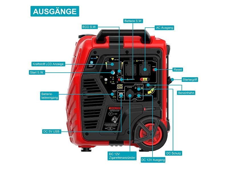 - Unabhängige Stromerzeugung ohne Spannungsschwankungen: für den mobilen Betrieb von 230-V-Geräten, USB-Geräten sowie 12-V-Geräten
