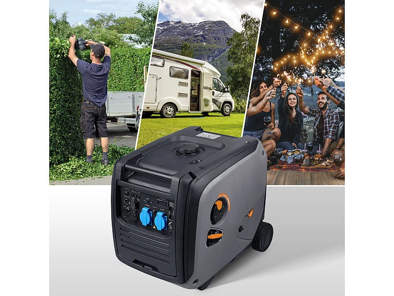 Erzeugen Sie Ihren eigenen Strom – daheim und unterwegs: Dank Ihres neuen Benzin-Inverter-Generators sind Sie jetzt unabhängig von der Netzversorgung. Ob beim Camping, auf Gartenfesten oder beim Werkeln im Hof – dank groĂźem 12-Liter-Tank versorgt Sie Ihr Generator Tag und Nacht zuverlässig mit Strom. Ein ausziehbarer Griff und zwei Räder machen den Transport von A nach B besonders bequem.