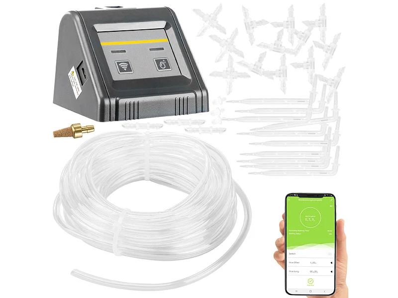 - Bewässerungsanlage mit Wasserpumpe inklusive USB-Stromkabel, 10-Meter-Schlauch, Filter, 14 Schlauchverbinder, 10 Bewässerungs-Spieße, 2 Stopfer für Schlauchenden, Montagematerial und deutscher Anleitung