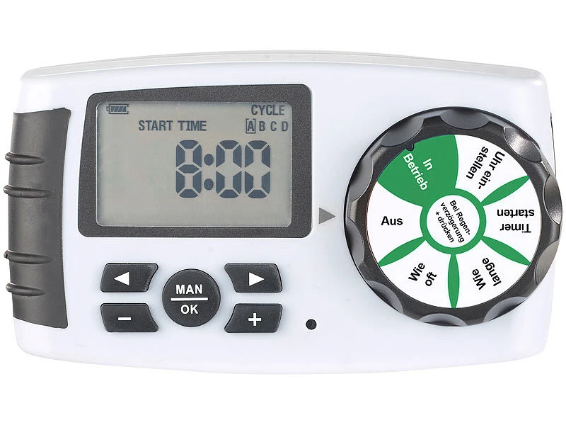 - Einstellbare Bewässerungs-Pause bei Regen: 24 / 48 / 72 Stunden (Regensensor nicht enthalten)