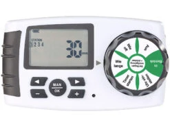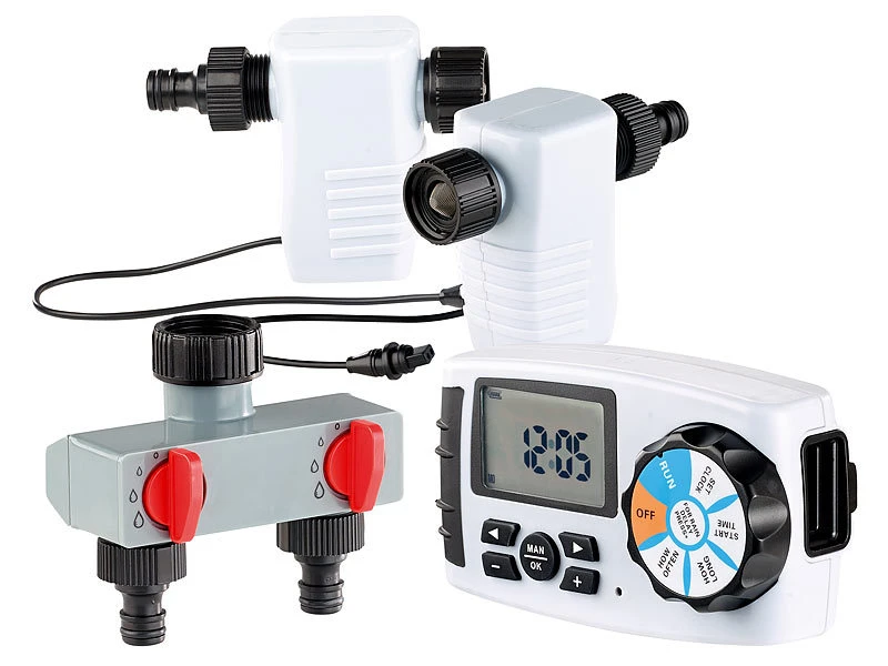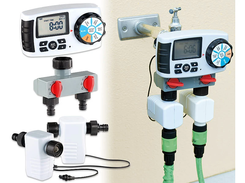 - Bewässerungs-Computer inklusive 2 Bewässerungs-Adaptern, 2 Schlauch-Schnell-Kupplungen, 2-Wege-Wasserverteiler, Wasserhahnverbinder und deutscher Anleitung