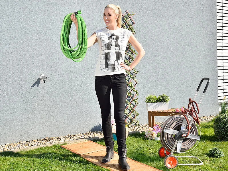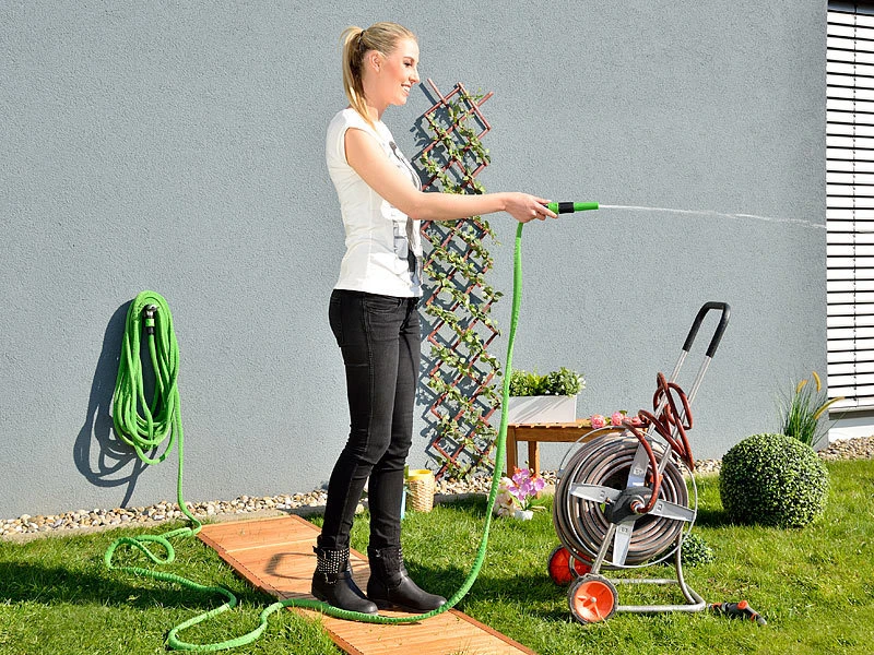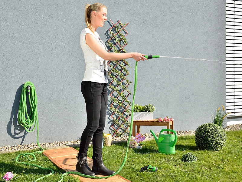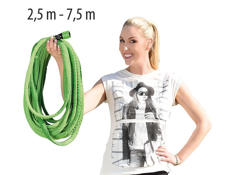 Einfach magisch: Dieser kompakte und federleichte Gartenschlauch wird bis zu 7,5 Meter lang, sobald Sie das Wasser aufdrehen. Und nach dem GieĂźen zieht er sich wieder klein zusammen.