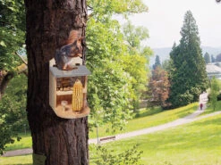 Bestens ausgestattet: Die geschickten Nager öffnen das Dach des Futterhäuschens selbstständig und nehmen sich das Futter heraus. Der große Vorbau mit Maiskolbenhalter und Futter-Ablagen sorgt dabei dank ausreichend Platz für Sicherheit.