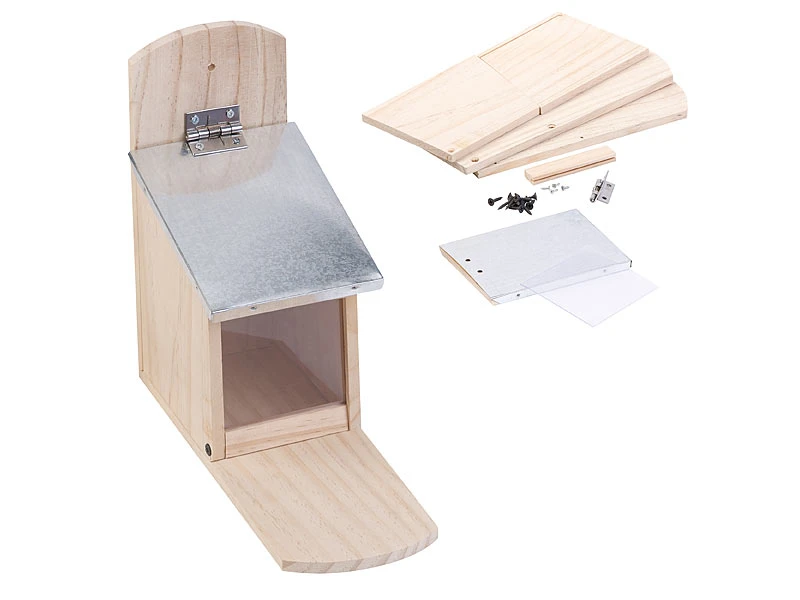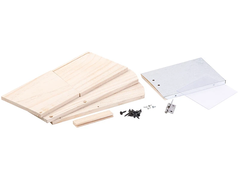 - Material: Bausatz aus getrocknetem, unbehandeltem Kiefernholz, Scheibe aus Kunststoff, Dach aus Blech