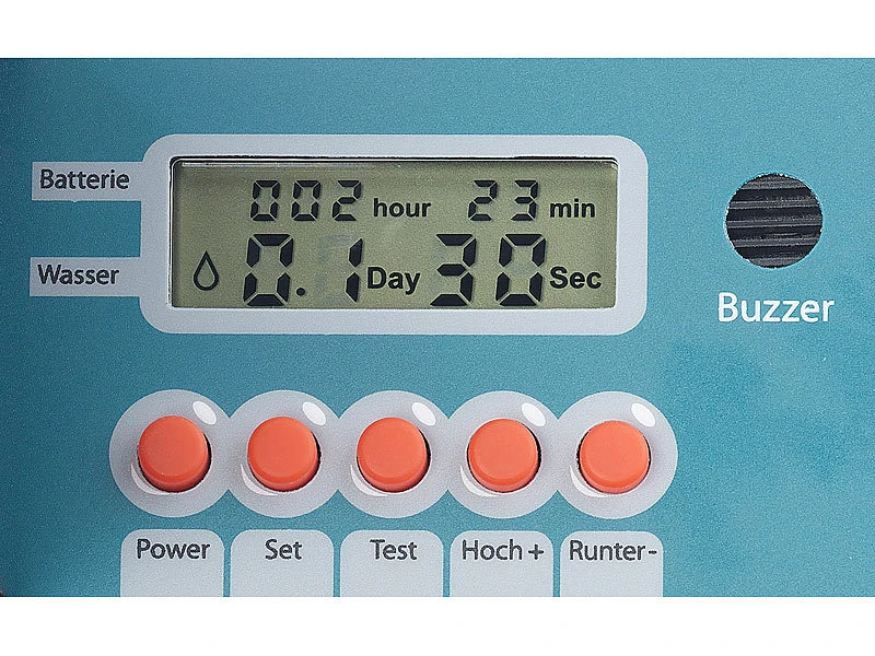 - LCD-Anzeige zeigt Bewässerungs-Frequenz und -Dauer an, signalisiert bei niedrigem Batterie- und Wasser-Stand