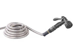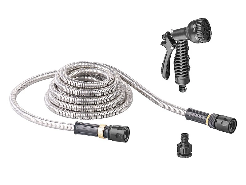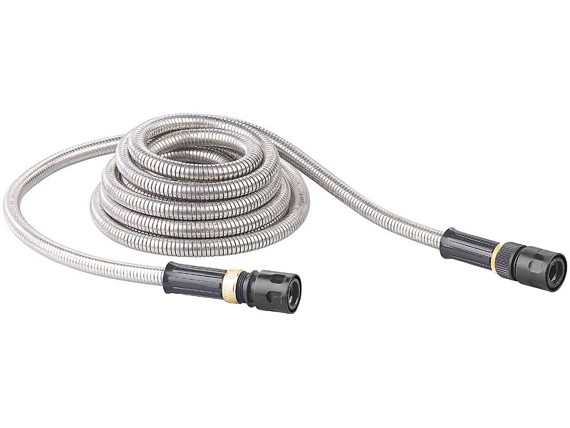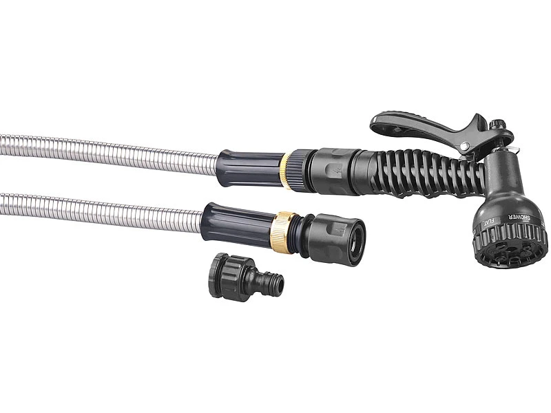 - Edelstahl-Gartenschlauch inklusive Brause und Aluminium-Adapter fĂŒr 3/4″-Wasserhahn – Metallschlauch – AuĂerdem relevant oder passend zu: Profi, Blume, Blumen, flexibel, Terrasse, Reinigung, Flexibler, BewĂ€sserung, Wasserschlauch dehnbar