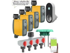 - Bewässerungscomputer BWC-500 mit WLAN-Gateway, 4 Bewässerungs-Ventilen mit Adaptern, Boden-Feuchtigkeitssensor, 4-fach-Wasserverteiler, 4 Schlauch-Schnell-Kupplungen, Wasserhahn-Verbinder und deutscher Anleitung