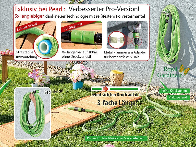 - Latex-Gartenschlauch und Adapter für 3/4”-Wasserhahn inklusive deutscher Anleitung – Gartenschlauch zum Ausziehen – Außerdem relevant oder passend zu: Flex, Blume, Flexi, Meter, Garten, dehnbar, Terrasse, flexibel, Reinigung, Flexibler, Wunderschlauch Original