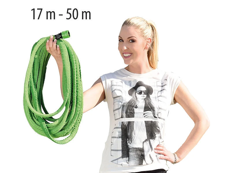 Einfach magisch: Dieser kompakte und federleichte Gartenschlauch wird bis zu 50 Meter lang, sobald Sie das Wasser aufdrehen. Und nach dem Gießen zieht er sich wieder klitzeklein zusammen.