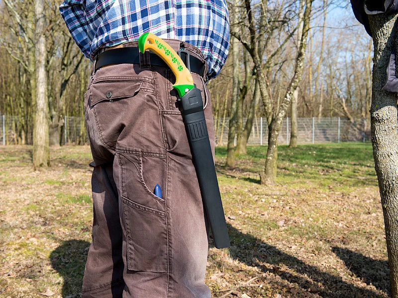 Sicher auch beim Transport: Zwischen den Einsätzen tragen Sie Ihre Handsäge komfortabel im Holster am Gürtel. So sind Sie auch vor den Zähnen gut geschützt.
