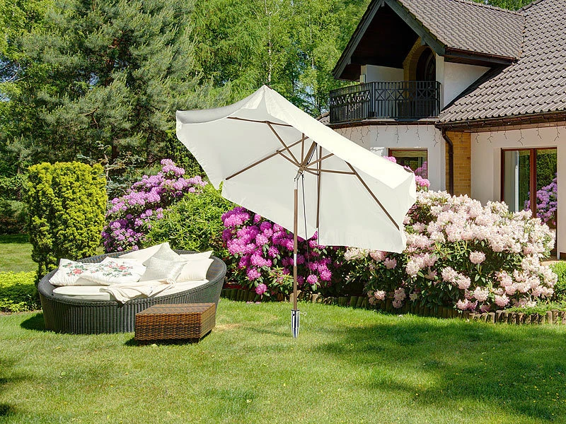 Einfach in den Boden eindrehen: Schon steht Ihr Sonnenschirm aus robustem Metall kipp- und windfest im Rasen oder in der Erde neben der Terrasse.