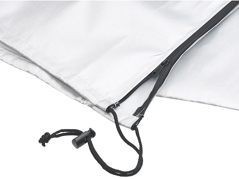 Passt perfekt und sitzt superfest: Einfach überstreifen und am Kordelzug ziehen – schon verrichtet die Schutzhülle ihren Dienst. Und einmal festgezurrt ist sie auch durch Sturm und Wolkenbruch nicht zu erschüttern.