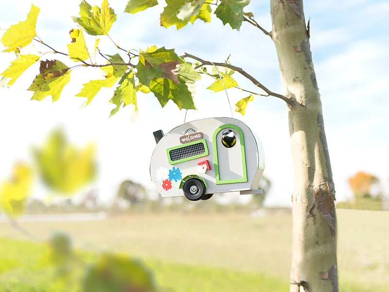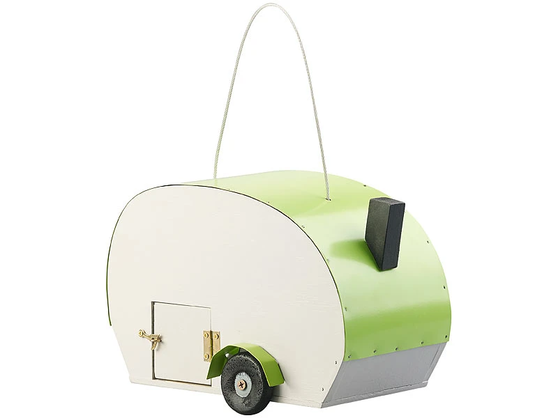 Hingucker im Garten: Dieser fröhliche Wohnwagen für Gartenvögel bereitet Ihrer ganzen Familie Freude. Lustig verziert schmückt er zu jeder Jahreszeit Ihren Garten. Hängen Sie den Wohnwagen für gefiederte Besucher einfach im Geäst auf.