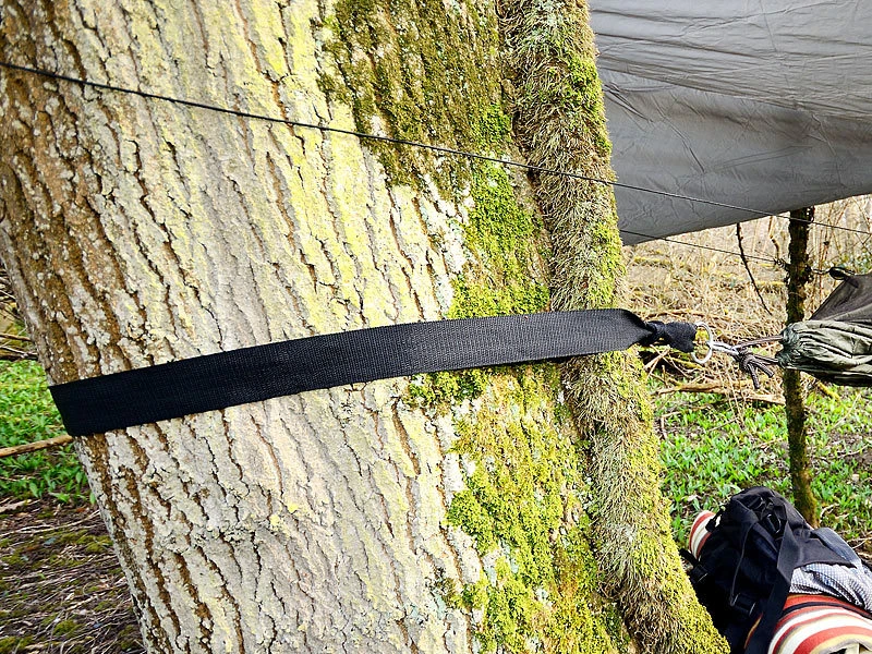 - Baum-Befestigungsset inkl. 2 Baumgurten (je mit Metallring und Karabinerhaken), Aufbewahrungsbeutel und deutscher Anleitung
